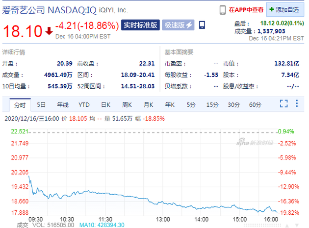 北京时间12月17日凌晨消息,周三收盘,爱奇艺股价大跌18.86%,报18.1美元,最新市值132.81美元。