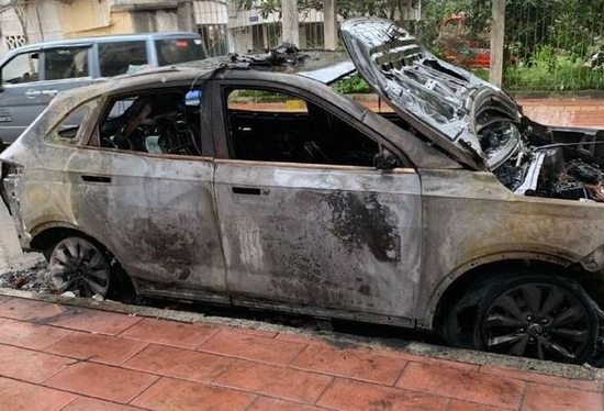 由于火势发展的极快,车身的其它部位,也迅速被大火覆盖。等到消防部门赶到后,车身已经被完全烧毁,大火扑灭之后,车辆被烧成了一个铁壳,整车成报废状态。