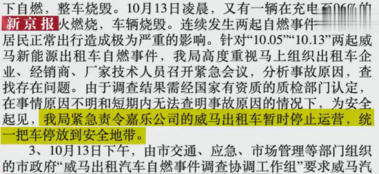 同日,福建邵武市交通运输局发布威马电动出租车连续两起自燃情况通报,称暂时停止威马电动出租车运营,统一把车停放到安全地带。10月1日,福建邵武市推动出租汽车纯电动化工作,共投放131辆新能源电动出租车,其中威马投放80辆。威马电动出租车投放后分别在10月5日、13日发生自燃。