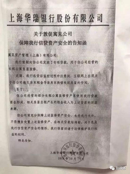 另外,钛媒体在企业征信信息平台启信宝查询工商信息时注意到,今年9月寓见还曾将部分股权出质给上海华瑞银行股份有限公司。华瑞银行在寓见爆仓后传出的告知函中透露,寓见这笔质权质押所得的专项贷款主要用于长租公寓房屋装修。