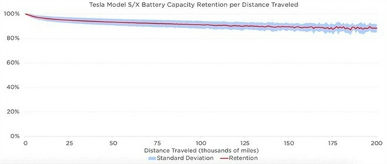 报告中,特斯拉更新了Model S和Model X的电池运行表现数据,声称这两款电动汽车在行驶20万英里后,其动力电池电能容量保留约为90%,即只衰减10%。