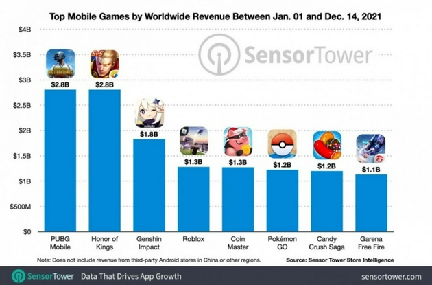 在这8款游戏当中,腾讯独中两元,旗下的《PUBG Mobile》与《王者荣耀》(Honor of Kings)分别排名前二,这两款游戏今年在全球市场分别吸金28亿,且同比分别增长9%与14.7%。紧随其后的则是米哈游旗下火爆了一年的《原神》,2021年里这款游戏的营收已经达到了18亿美元。