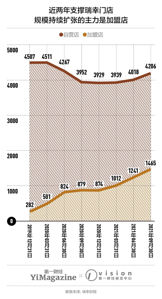 瑞幸2021年三季报显示,截至报告期期末,加盟店的规模已经涨至1465家,较年初净增586家。瑞幸直营门店则在2020年财务造假风波后经历了关店潮,陆正耀时代火速开拓的4500余家门店净关店数字接近560家。2021年重新恢复扩张,但前9个月仅新增了277家。