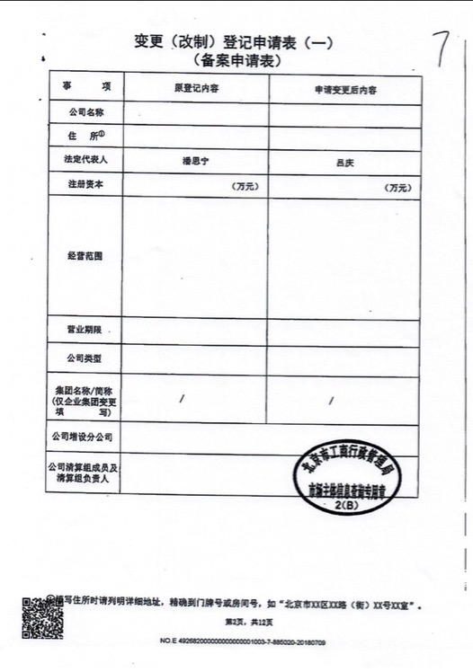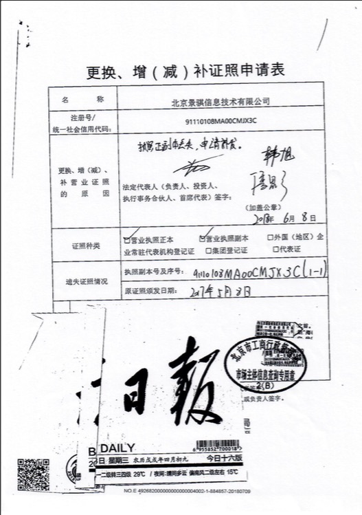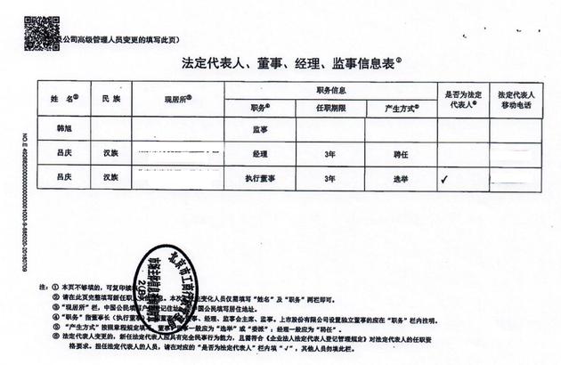 据记者获得的工商资料显示,北京景骐信息技术有限公司在今年6月1日举行了第二届第一次股东会议,会议应到3人,实到3人,会议形成两项决议:免去潘思宁的执行董事职务,同意选举吕庆为执行董事。该份文件下有潘思宁、韩旭、伍战涛的签字。