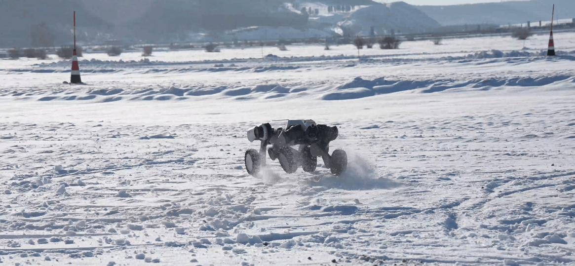 山猫M20机器狗在雪地行走 在光滑的雪面上,山猫M20轮足机器人高速连续奔跑,搭载的专用防滑雪地胎与云深处独有的实时姿态预测控制技术协同作业,实现了流畅的雪地漂移与精准转向。IP66级防护等级结合全域密封设计,保障其在飞雪、低温与潜在冰水侵袭中持续稳定运行,运动控制系统在极端工况下仍实现零失误响应,彰显出云深处科技在机器人运动控制领域的深层技术积累。