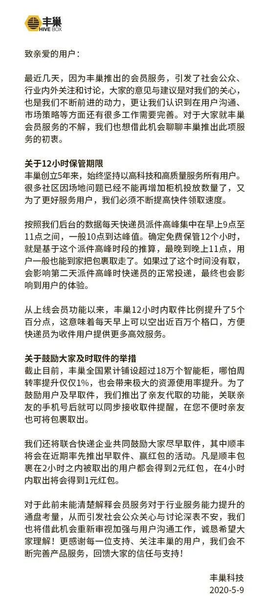 丰巢还表示:“对于此前未能清楚解释会员服务对于行业服务能力提升的通盘考量,从而引发社会公众关心与讨论深表不安,我们也将借此机会重新审视加强与用户沟通工作,诚恳希望大家理解。”