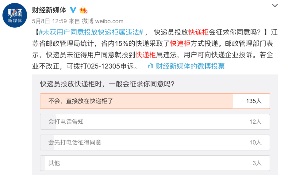 《财经》新媒体在微博上发起的“收快递小调查”显示,参与投票活动的161人中,有135人在收快递时遭遇了“不征得收件人同意、直接将物品放入快递柜”,比率达到83.85%。