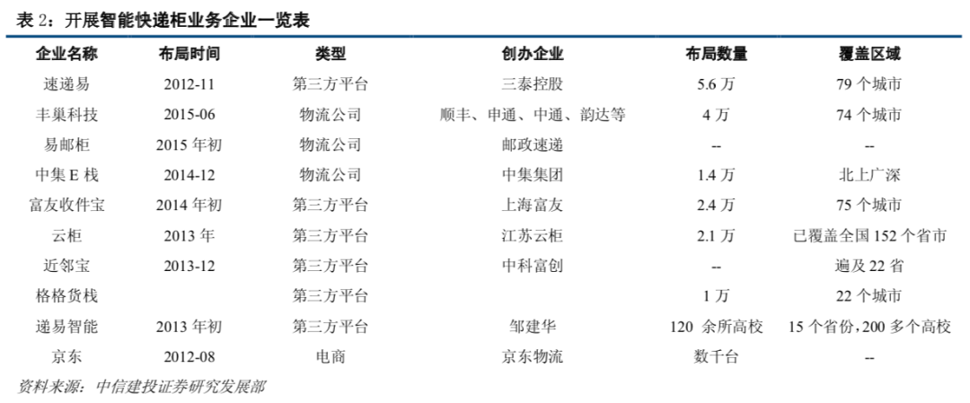 开展智能快递柜业务企业一览表 。图/中信建投证券研究发展部