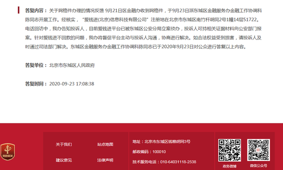 9月21日,有爱钱进的出借人将该平台债转缓慢、信息不透明化等相关情况,投诉至北京市东城区人民政府。9月23日下午,东城区金融办金融工作协调科就相关投诉,进行了回复和后续情况的说明。