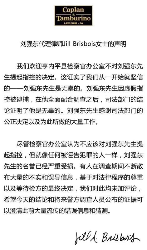 同时,据外媒报道,刘强东代理律师Jill Brisbois也发布了律师声明,内容如下: