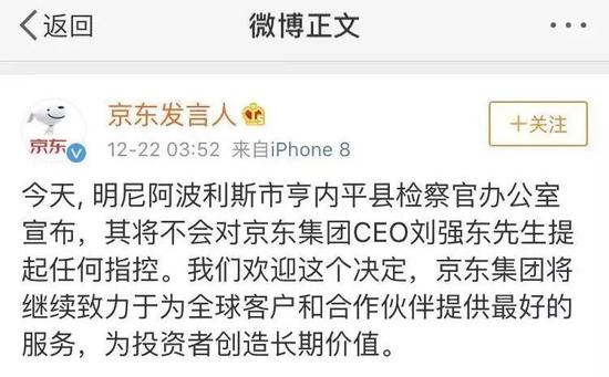 今天,明尼阿波利斯市亨内平县检察官办公室宣布,其将不会对京东集团CEO刘强东先生提起任何指控。我们欢迎这个决定,京东集团将继续致力于为全球客户和合作伙伴提供最好的服务,为投资者创造长期价值。