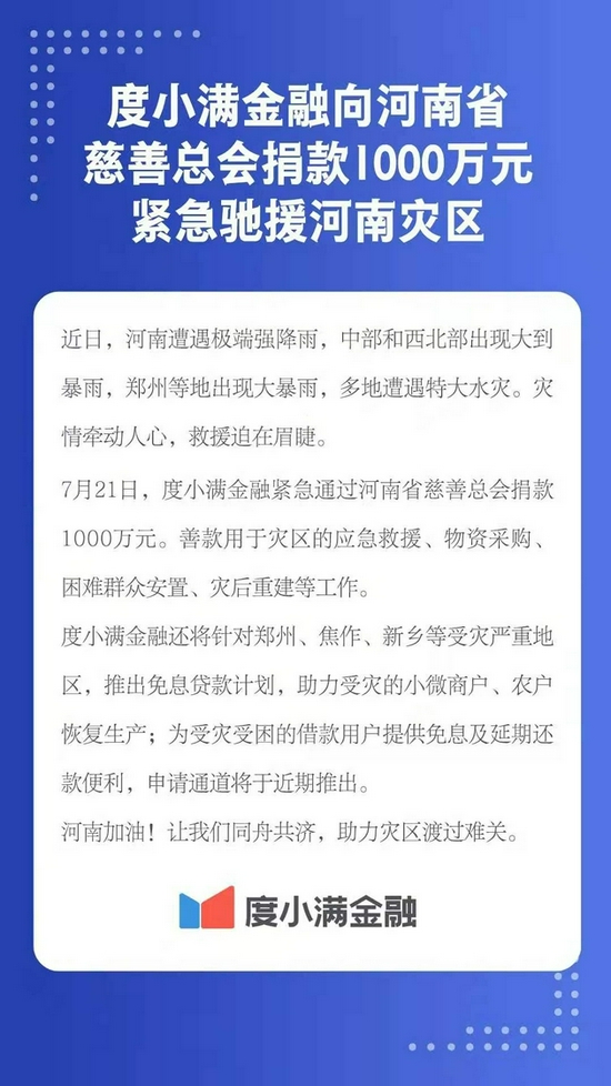 7月21日下午消息,度小满金融宣布,度小满金融向河南省慈善总会捐款1000万元紧急驰援河南灾区。善款用于灾区的应急救援、物资采购困难群众安置、灾后重建等工作。