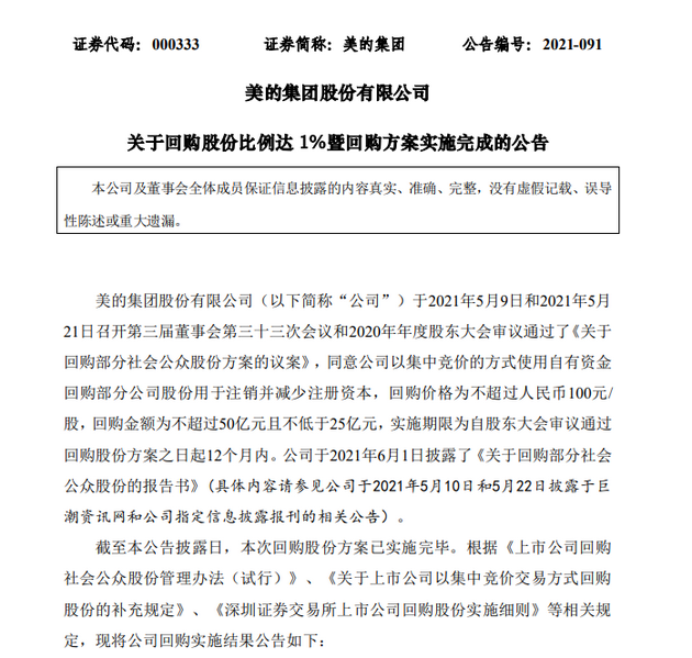 IT商业科技网讯,8月13日晚间消息,美的集团发布公告称,回购方案实施完成。截至2021年8月13日,公司累计回购股份数量为7197.62万股,占公司总股本的1.0205%,最高成交价为79.15元/股,最低成交价为61.43元/股,支付的总金额达回购方案的金额上限50亿元。