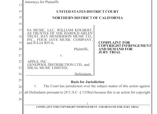 这起新诉讼案列举了几位原告的名字,他们过去曾对苹果公司提起过诉讼,如SA Music、 The Harold Arlen Trust、Ray Henderson Music Company 及Four Jays Music Company.