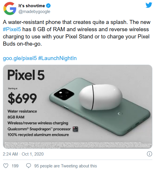 其它规格为8GB内存,128GB内部存储,4080mAh电池,IP68防水,18W USB-C快速充电。正如预期的那样,最新的Pixel与往年有些不同。谷歌没有去追求绝对最好的规格,而是提供了一套略微温和的规格和更低的价位:Pixel 5的起售价为699美元,比Pixel 4的799美元起售价降低了100美元。