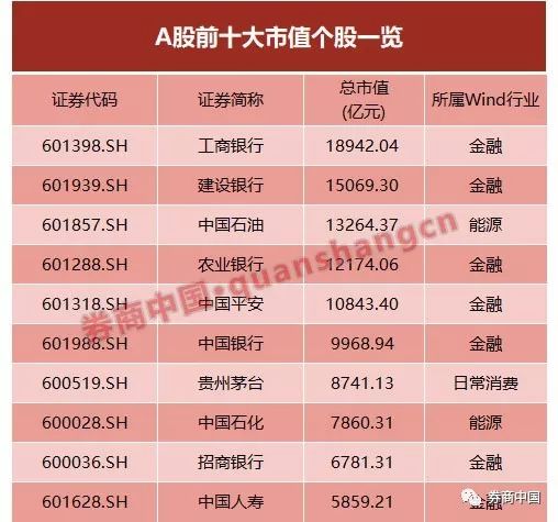 反观A股前十大市值个股,金融股成为绝对主力。7家公司属于金融板块,2家公司属于能源板块,1家属于日常消费,无1家科技公司。