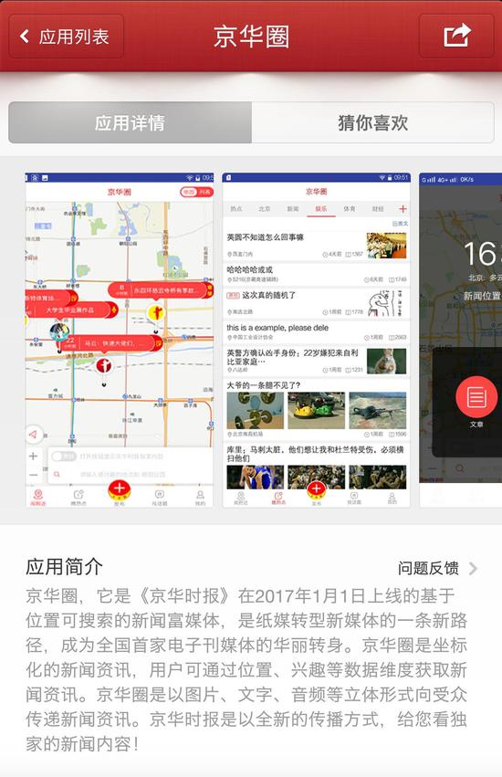 2017年1月1日,由《京华时报》上线的基于位置可搜索的新闻富媒体“京华圈”App正式上线,在应用商店里,关于这款App的介绍中说,“
