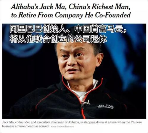 根据纽约时报称,Alibaba’s co-founder and executive chairman, Jack Ma, said he planned to step down from the Chinese e-commerce giant on Monday to pursuephilanthropy in education.Mr。 Ma will remain on Alibaba’s board of directors and continue to mentor the company’s management,即马云计划于“周一”辞去阿里巴巴董事局主席一职,以专注教育相关的慈善事业。马云将继续留任在阿里巴巴董事会,以指导管理层。