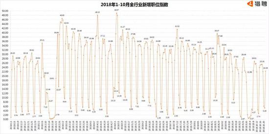 根据猎聘大数据“2018年1-10月全行业新增职位指数”,从2018年9月中旬以来,全行业新增职位指数呈现较明显下降。