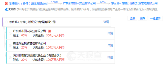 从其股权结构来看,京合都股权投资的大股东是都市丽人,出资300万元持有60%的股份,二股东是宿迁辉远投资管理有限公司,宿迁辉远投资就是京东集团旗下京东邦能投资的全资子公司,刘强东为总经理。此外,还拥有复星集团、腾讯、唯品会、中瑞控股、万达集团、永辉集团等具备强大背景和优质资源的企业作为间接股东。